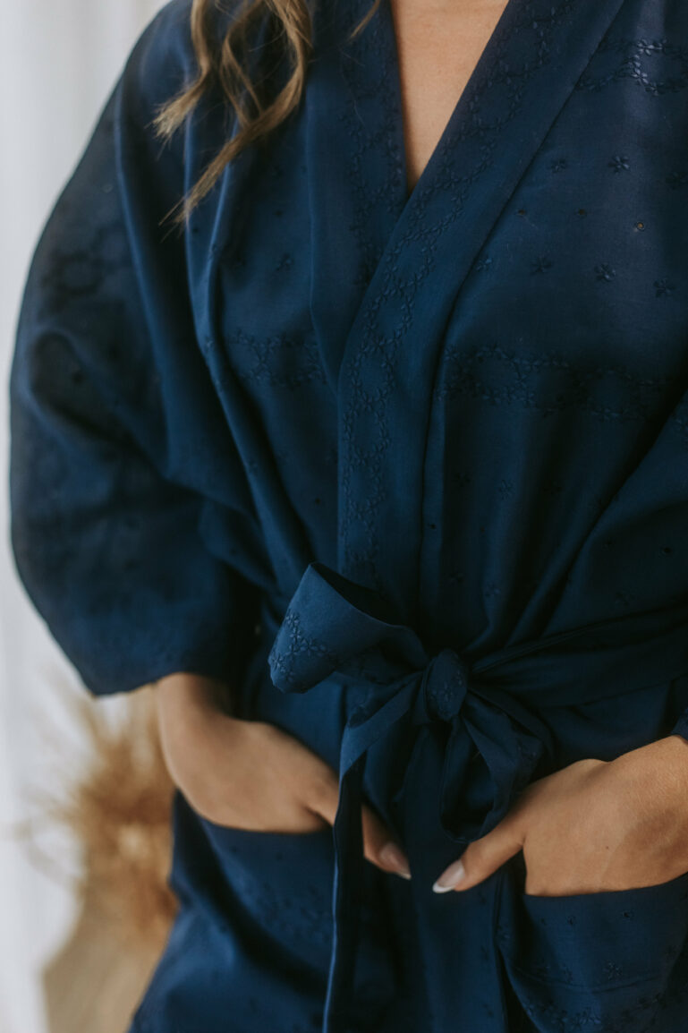A l'atelier, Delphine Letellier a chiné par hasard sur une brocante quelques mètres d'un coton bleu nuit constellé de ces broderies. Issu d'un industriel textile suisse aujourd'hui disparu, ce tissu n'attendait que d'être réemployé. Sa légère tenue permet de donner une coupe moderne au kimono pour lequel il a été utilisé tout en lui conservant sa poésie d'autrefois. Quelques déshabillés ont ainsi pu être confectionnés pour quelques privilégiées, il n'en reste à ce jour qu'un de disponible à l'atelier qui n'attend que vous !