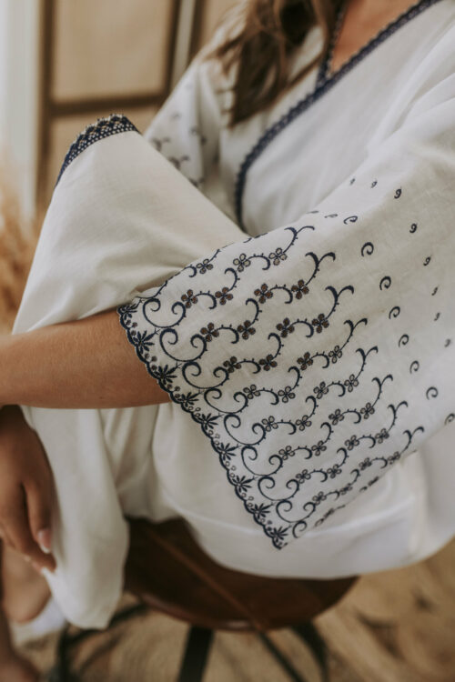 Création unique, Ancolie est un kimono en broderie anglaise de coton blanche brodée de bleu qui se noue à la taille. Ample et doté de poches, il est parfait pour un dimanche matin à déambuler avec votre tasse de thé à la main. Dans ce coton qui a une légère tenue, il vous pare comme une chemise élégante. Il sera parfait pour boire une coupe de champagne, et profiter pleinement des préparatifs de votre mariage.