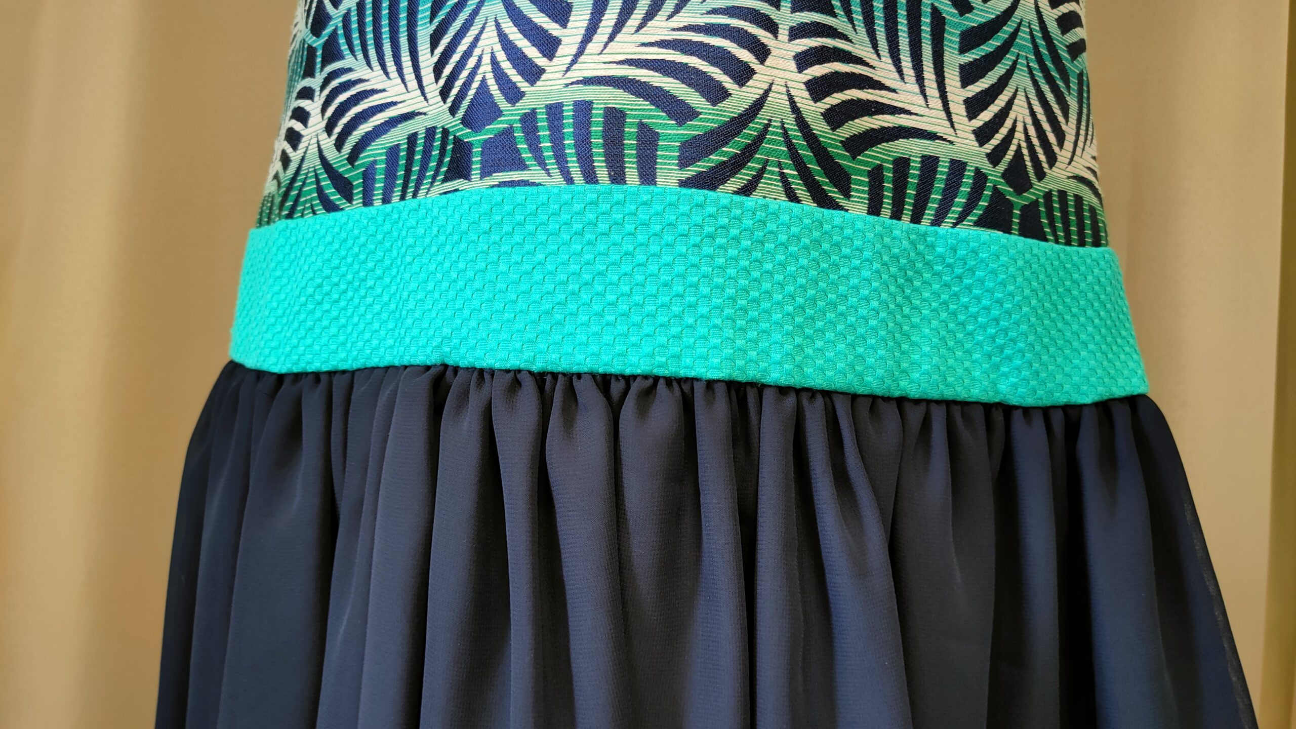 Twenties est un prototype de robe style année 20, une coupe légèrement évasée et de la mousseline bleu nuit qui vole délicatement sur les jambes. Réalisée dans un jacquard bleu vert aux motifs géométriques : c’est une robe qui danse à chacun de vos pas ! Elle se pare d’un joli décolleté dos et d’un nœud de mousseline bleu nuit qui peut permettre de cacher l’attache d’un soutien-gorge.